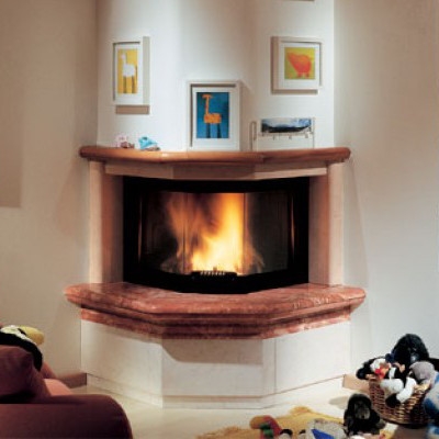 Угловая компактная модель камина в розовом мраморе Rrosa Perlino, обработанном под старину. Плита и верхняя деталь цоколя из красного мрамора Rosso Skiros. Деревянная балка.